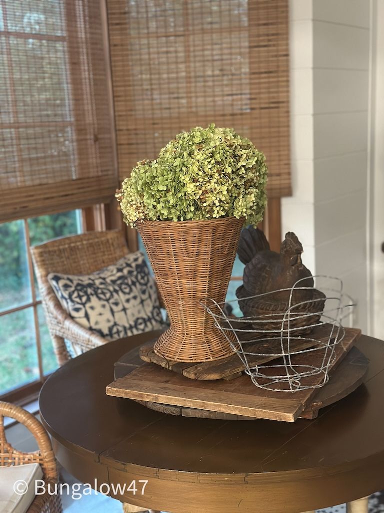 I bought this wicker one at Magnolia. It has a glass cylinder in the center that would hold water if needed. Of course, since I have been home, I have been so busy so I just plopped some dried hydrangeas I had hanging around in it.